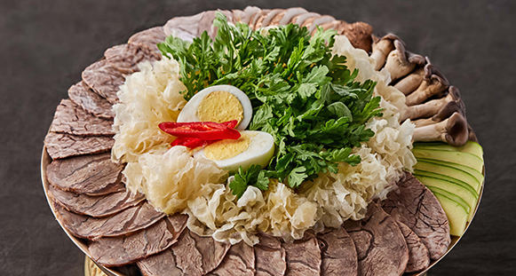 평안북도 정주식 감성을 담아, 맑지만 깊은 한우 양지 육수에 고기와 버섯,채소를 돌려 담았습니다.